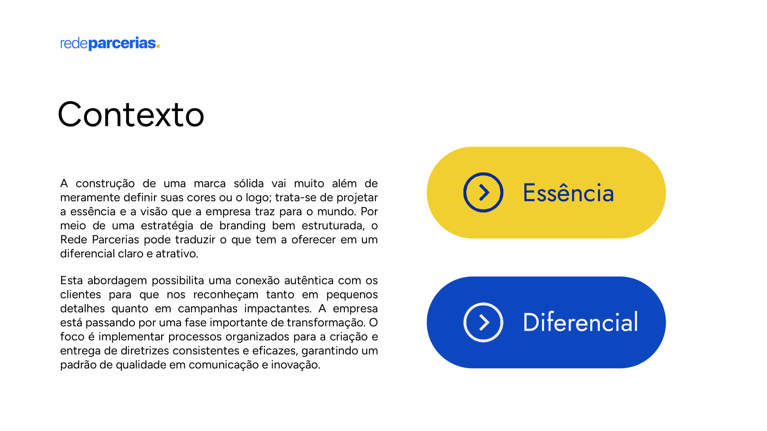 O projeto de rebranding da Rede Parcerias teve como objetivo reposicionar a marca no mercado, fortalecendo sua presença e alinhando-a a uma nova fase de expansão e inovação. Conduzi o processo estratégico desde o diagnóstico até a implementação, redefinindo o propósito, arquétipo, tom de voz e expressão visual da marca.