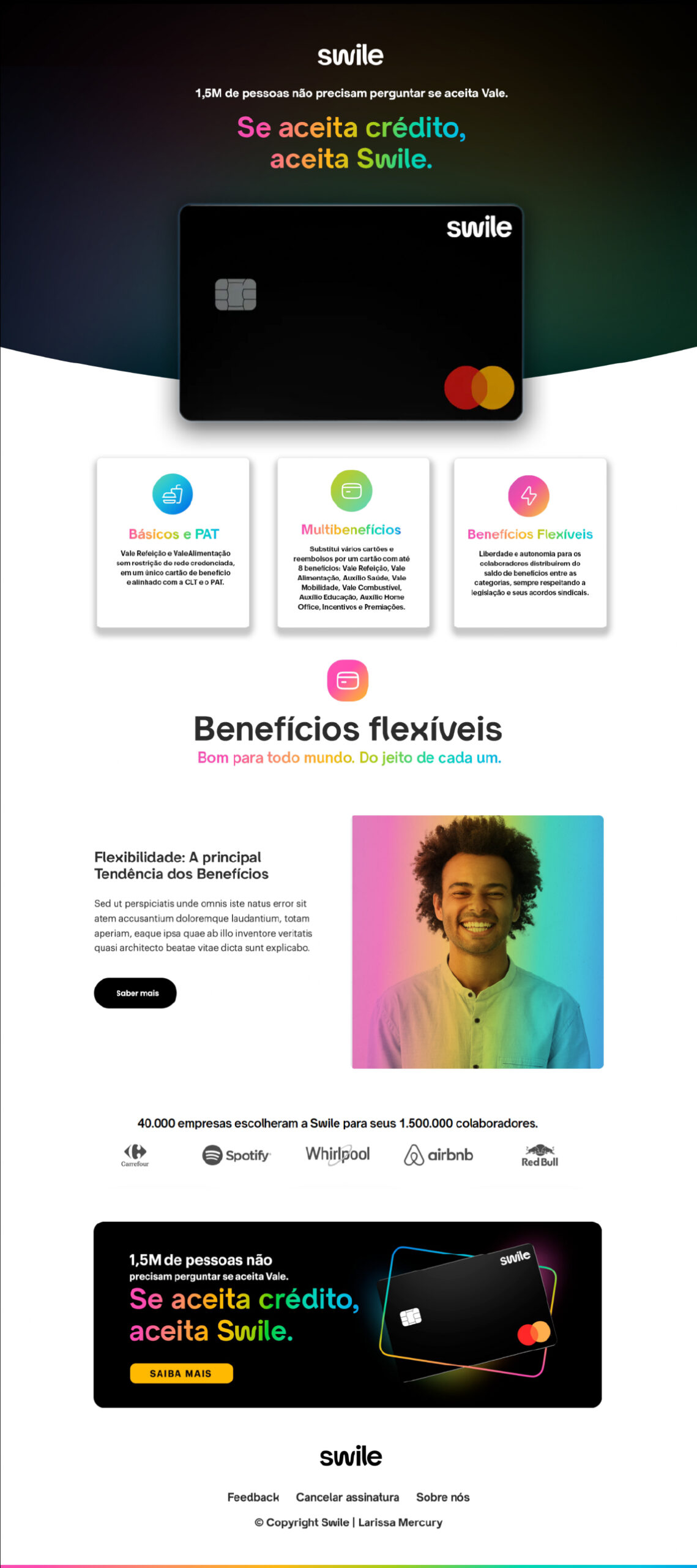 A proposta equilibra design clean, narrativa visual envolvente e linguagem acessível, transmitindo confiança e inovação — pilares essenciais do posicionamento da Swille. O resultado é um material visual coeso, que reforça a presença da marca e potencializa a performance das suas comunicações.